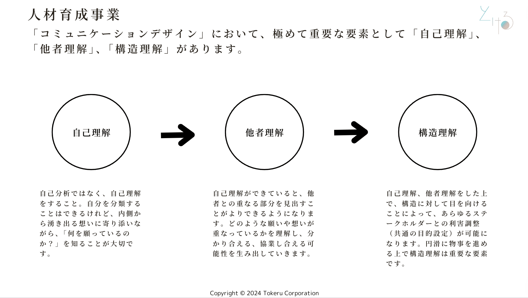 事業内容株式会社とけるは「コミュニケーションデザイン」を軸とした事業設計を行なっています。1, 人材育成事業2, チームビルディング3, 研修事業・講座・WS(ワークショップ)4, ブランディング事業5, 伴走事業(経営コンサルティング)6, メディア事業コミュニケーションデザインを軸とした事業内容1, 人材育成事業「コミュニケーションデザイン」を軸とし、コミュニケーションスキルを高めていける講座や 1 on 1サービスを開発しています